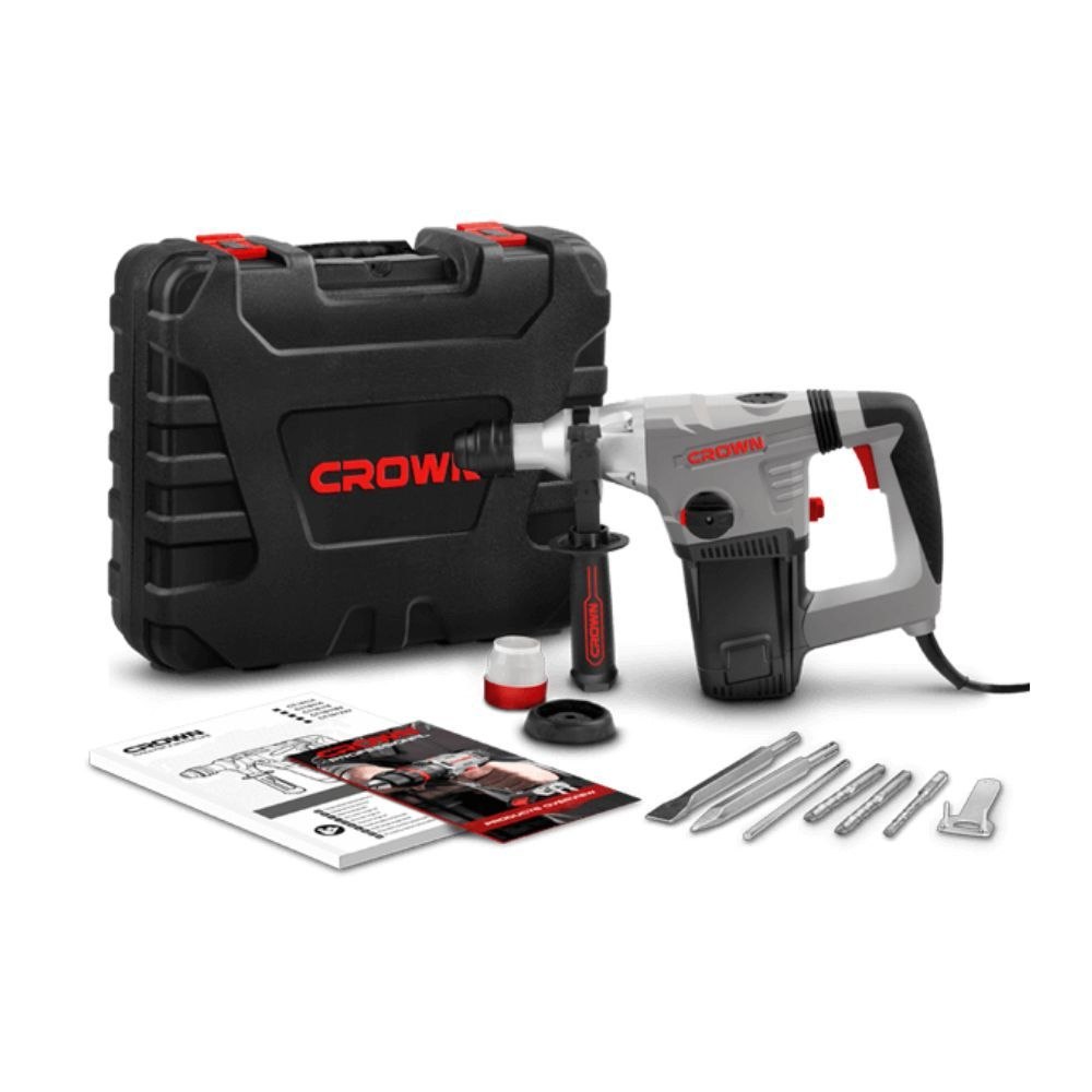 مطرقة ثقب وهدم احترافية (CROWN) بقوة 1050 واط ونظام SDS-Plus « تعتبر المطرقة الدوارة من علامة Crown موديل CT18116 BMC أداة لا غنى عنها في أعمال البناء والترميم الشاقة. توفر هذه الآلة قوة طرق تصل إلى 4.8 جول، مما يجعلها مثالية لثقب الخرسانة، الطوب، والحجر بكل سهولة بفضل محركها القوي ذو الـ 1050 واط.